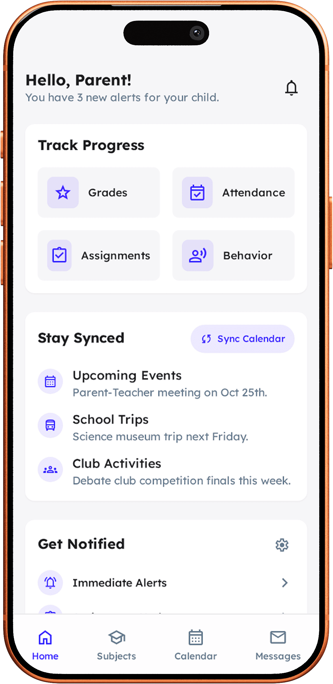 Get real-time updates on absences, new assignments, schedule changes, and school events — fully customizable to your needs.